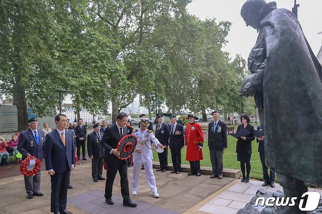 (서울=뉴스1) 김명섭 기자 = '임진강전투 70주년'을 맞아 영국 참전용사들을 위로하기 위해 영국을 방문중인 황기철 국가보훈처장이 현지시각 27일 오전 영국 런던에 위치한 한국전 참전비에서 건 주영국대한민국 대사관과 현지 참전용사들과 헌화 및 참배를 하고 있다. (국가보훈처 제공) 2021.9.27/뉴스1
