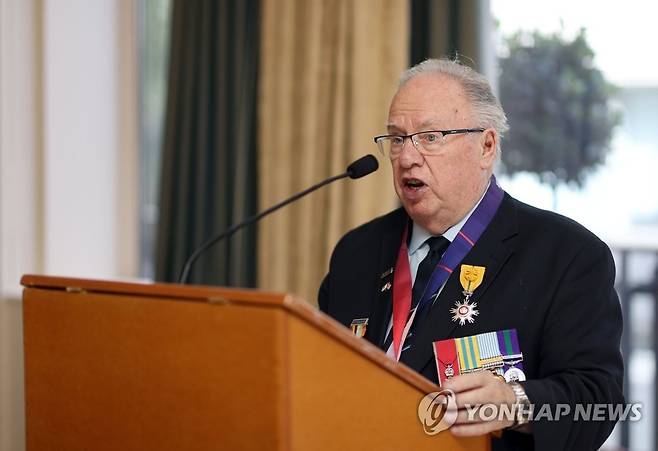 (서울=연합뉴스) '임진강전투 70주년'을 맞아 영국 참전용사들을 위로하기 위해 영국을 방문 중인 황기철 국가보훈처장이 27일(현지시간) 영국 런던의 육군·해군회관에서 열린 참전용사 감사오찬에서 알란가이 참전용사 대표가 인사말을 하고 있다. 2021.9.27 [국가보훈처 제공. 재판매 및 DB 금지]