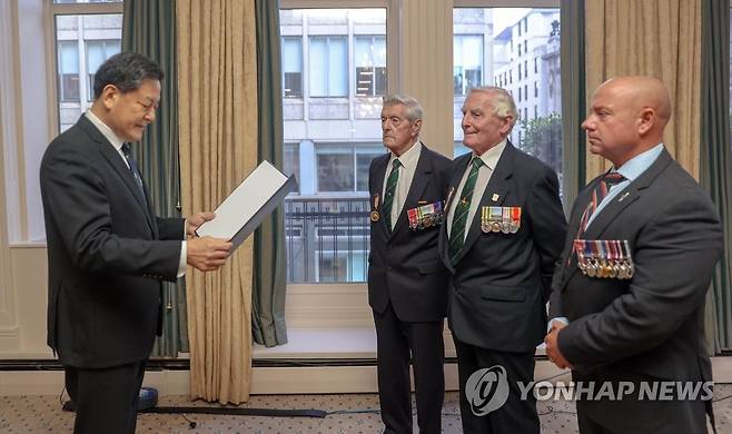 (서울=연합뉴스) '임진강전투 70주년'을 맞아 영국 참전용사들을 위로하기 위해 영국을 방문 중인 황기철 국가보훈처장이 27일(현지시간) 영국 런던의 육군·해군회관에서 열린 참전용사 감사오찬에서 고(故) 더글라스 드라이스테일 대령의 훈장을 왕립 해병대 자선센터에 전달하고 있다. 2021.9.27 [국가보훈처 제공. 재판매 및 DB 금지]