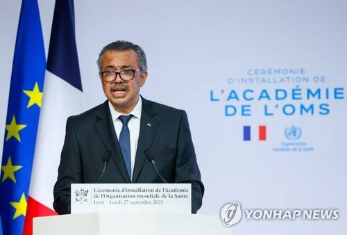 epa09491652 WHO Director-General Tedros Adhanom Ghebreyesus speaks during the WHO Academy opening ceremony chaired by him and French President Emmanuel Macron (not pictured), in Lyon, France, 27 September 2021. EPA/DENIS BALIBOUSE / POOL MAXPPP OUT