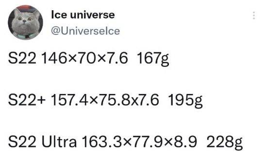 아이스유니버스에 따르면 추후 ‘갤럭시 노트22 울트라’로 출시될 수 있는 S22 울트라의 무게는 228g으로 전망된다. 이는 초고주파 5G를 지원하는 전작 ‘갤럭시 S21 울트라(229g)’는 물론 최근 공개된 애플의 최상급 모델인 ‘아이폰13 프로 맥스(240g)’보다 가벼운 수치다. 다만 초고주파(mmWave) 5G 지원 모델에 적용되는지 6GHz 이하(Sub-6) 5G 네트워크만 지원하는 버전에 적용되는지는 확실하지 않다.