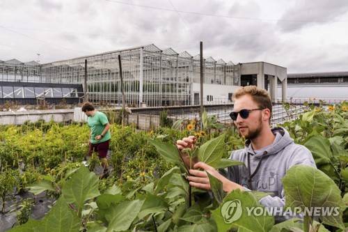 Workers tend to plants on a rooftop of an urban building as part of the Atelier Groot Eiland project in Brussels, Monday, Sept. 27, 2021. The community supported project currently contains four vegetable gardens, in which high value crops are harvested, on a normally unused urban space. (AP Photo/Geert Vanden Wijngaert)