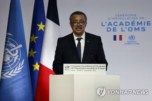 epa09491663 WHO Director-General Tedros Adhanom Ghebreyesus delivers a speech during a ceremony for the opening of the World Health Organisation Academy in Lyon, eastern France, 27 September 2021. EPA/LUDOVIC MARIN / POOL MAXPPP OUT