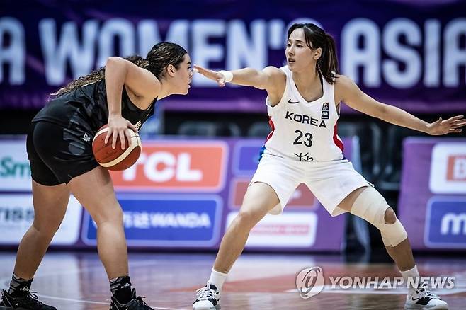 (서울=연합뉴스) 27일(한국시간) 요르단 암만에서 열린 2021 국제농구연맹(FIBA) 여자 아시아컵 한국과 뉴질랜드의 경기에서 정선민 감독이 이끄는 한국은 이날 경기에서 김단비가 수비하고 있다. 85-69로 승리했다. 2021.9.27 [FIBA 홈페이지 캡처. 재판매 및 DB 금지]