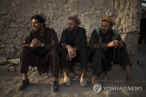 Afghans sit outside a mosque in a poor neighborhood where hundreds of internally displaced people from the eastern part of the country have been living for years, in Kabul, Afghanistan, Monday, Sept. 27, 2021. (AP Photo/Felipe Dana)