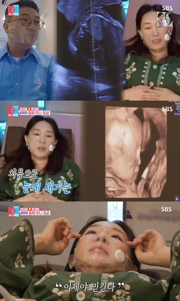 이어 다시 들어가 초음파를 진행했고, 미니의 얼굴이 최초 공개됐다. 이지혜는 "너무 신기하다. 눈물난다"며 "너무 감동이다. 실감이 안 나다가 이제야 믿긴다"고 말했다. 옆모습을 본 이지혜는 "코가 안 낮다. 다행이다. 코가 남편 닮아서 높다. 제가 옛날에 코가 좀 없었다"며 너스레를 떨었다.