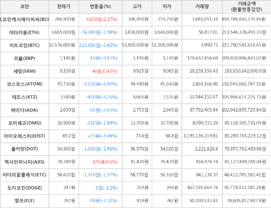 [표]가상화폐 시세 (제공: 암호화폐 거래소 업비트)