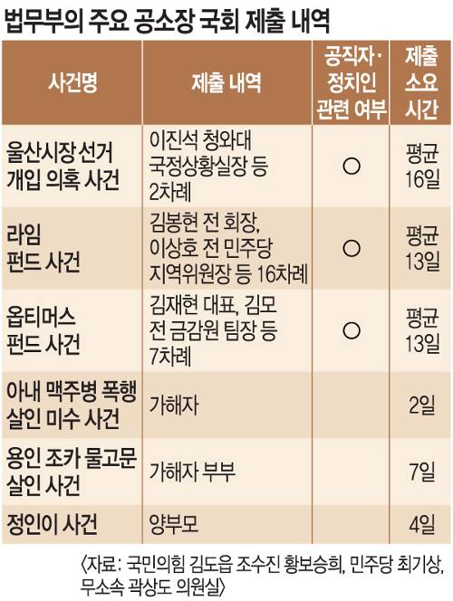 문제는 법무부의 공소장 제출 여부와 시점이 사안에 따라 달라졌다는 것이다. 국회는 특히 울산시장 선거개입 의혹 사건과 관련해 2차례, 라임 펀드 사건과 관련해 16차례, 옵티머스 펀드 사건과 관련해 7차례 공소장을 제출받았다. 이 사건 모두 여권 관계자 연루 의혹이 제기되는 등 정치적으로 민감했던 사건이었다. 법무부가 공소장 제출을 요청받아 제출하는 데 걸린 시간을 살펴보면 울산 사건은 평균 16일, 라임·옵티머스 펀드 사건은 평균 13일이 각각 걸렸다.