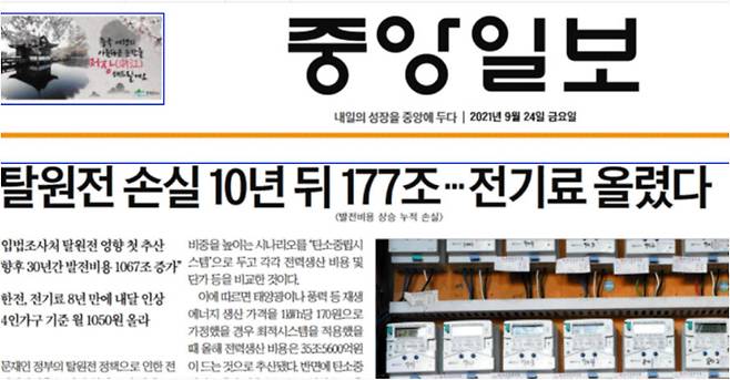 지난 24일 <중앙일보> 인터넷판이 ‘단독’이라며 내건 기사 제목이다. 같은 기사는 이날 아침 <중앙일보> 1면에는 “탈원전 손실 10년 뒤 177조…전기료 올렸다”라는 제목에 “입법조사처 탈원전 영향 첫 추산, ‘향후 30년간 발전비용 1067조 증가’”라는 부제가 달려 나갔다.