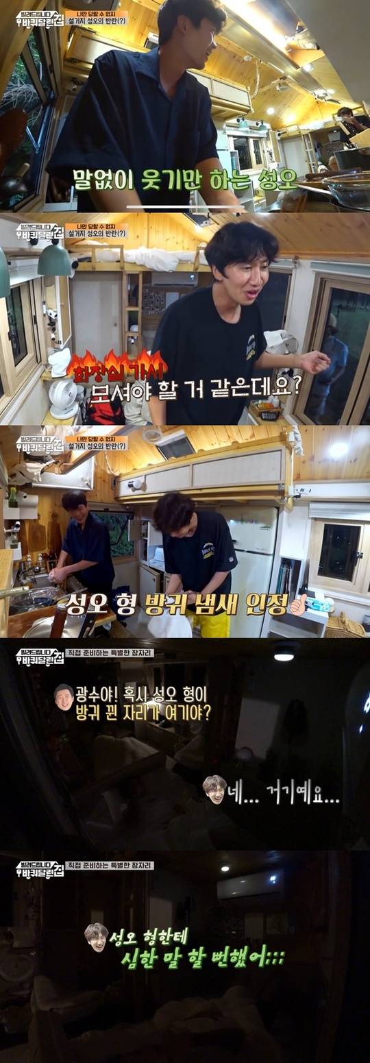 이광수와 김성오는 함께 설거지를 하며 뒷정리를 했다. 그러던 중 김성오가 방귀를 뀌었고 이광수는 "아 형"이라며 자리를 피했다. 그러더니 "화장실 가서 한 번 보셔야 할 것 같은데요. 창문이 바로 옆에 있는데 어떻게 이럴 수가 있지"라며 질색했다.