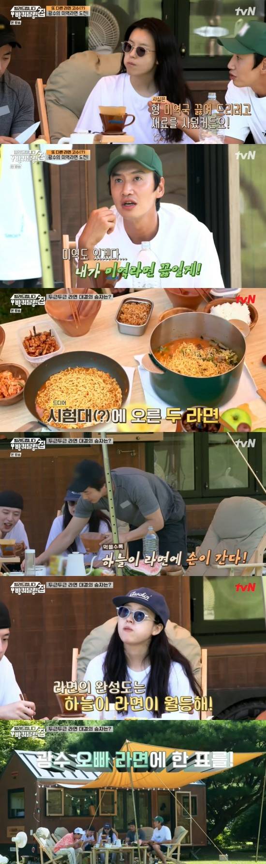 이광수와 강하늘은 각자 라면을 끓였고, 이광수는 볶은 소고기와 미역에 사골육수를 넣어 미역국을 완성했다. 이광수는 "이대로 먹어도 된다"라며 자랑했고, 라면 수프를 한 봉지와 채소를 추가했다.