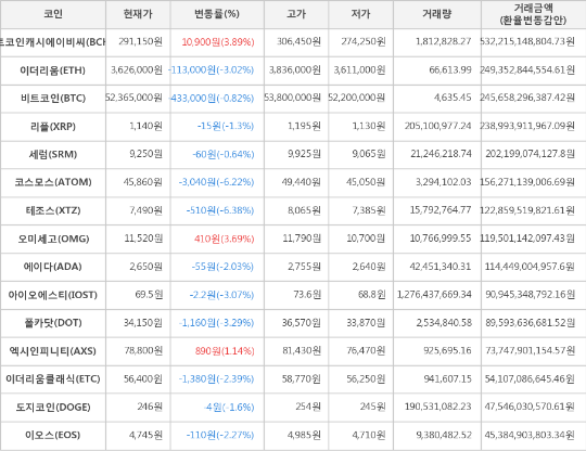 [표]가상화폐 시세 (제공: 암호화폐 거래소 업비트)