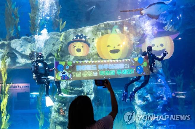 (서울=연합뉴스) 지난 27일 서울 송파구 롯데월드 아쿠아리움 메인수조에서 아쿠아리스트가 오픈 7주년 기념 축하 메시지가 적힌 현수막을 펼쳐 보이는 수중 퍼포먼스를 진행하고 있다. 2021.9.28