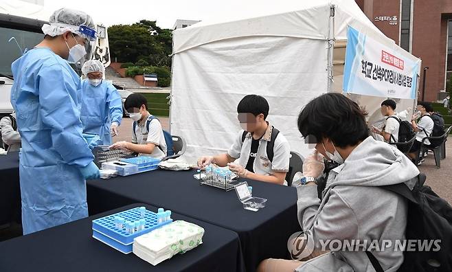 (서울=연합뉴스) 28일 오전 서울 종로구 동성고등학교에 마련된 '학교 신속 PCR검사 시범사업 운영소'에서 학생들이 검체를 채취하고 있다. 2021.9.28 [사진공동취재단]