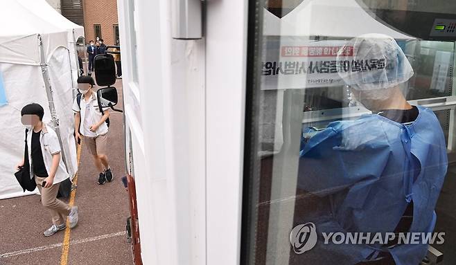 (서울=연합뉴스) 28일 오전 서울 종로구 동성고등학교에 마련된 '학교 신속 PCR검사 시범사업 운영소'에서 의료진이 학생들에게 채취한 검체를 검사소 바로 옆에 위치한 이동형 검사실로 옮겨 코로나19 감염 여부를 확인하고 있다. 2021.9.28 [사진공동취재단]