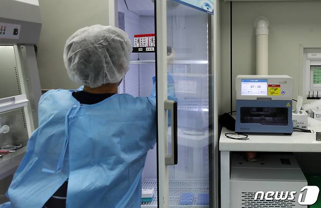 (서울=뉴스1) 사진공동취재단 = 28일 오전 '신속 자가분자진단 유전자증폭(신속 PCR)' 검사소가 마련된 서울 종로구 동성고등학교에서 의료진이 학생들에게 채취한 검체를 검사소 바로 옆에 위치한 이동형 검사실로 옮겨 코로나19 감염 여부를 확인하고 있다.