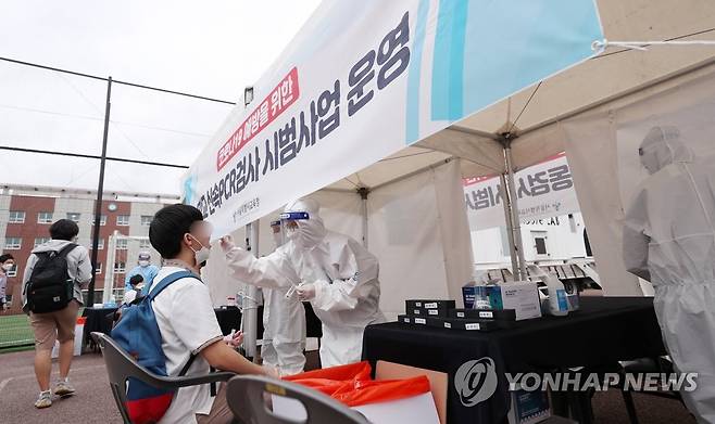 (서울=연합뉴스) 28일 오전 서울 종로구 동성고등학교에서 학생들이 신속 자가분자진단 유전자증폭(신속 PCR) 검사를 받고 있다. 2021.9.28 [사진공동취재단]