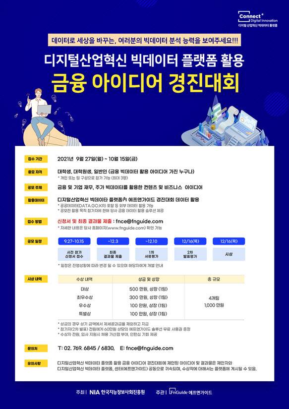 한국지능정보사회진흥원(NIA) 주최, 에프앤가이드 주관으로 개최되는 '디지털산업혁신 빅데이터 플랫폼 활용 금융 아이디어 경진대회'는 디지털산업혁신 빅데이터 플랫폼 내 빅데이터를 활용해 데이터 생태계 조성과 금융, 주가, 기업정보 등의 데이터를 활용한 다양한 콘텐츠 및 비즈니스 아이디어 발굴을 위한 취지에서 마련됐다.