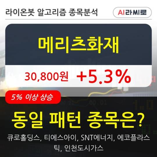 이 시각 거래소에서 메리츠화재 이외에도 큐로홀딩스(11.72%), 티에스아이(9.63%), SNT에너지(6.08%), 에코플라스틱(11.53%), 인천도시가스(5.42%) 등이 상승세를 보이고 있다.