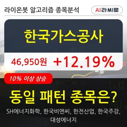 이 시각 거래소에서 한국가스공사 이외에도 SH에너지화학(14.08%), 한국비엔씨(15.69%), 한전산업(10.22%), 한국주강(24.7%), 대성에너지(21.39%) 등이 상승세를 보이고 있다.