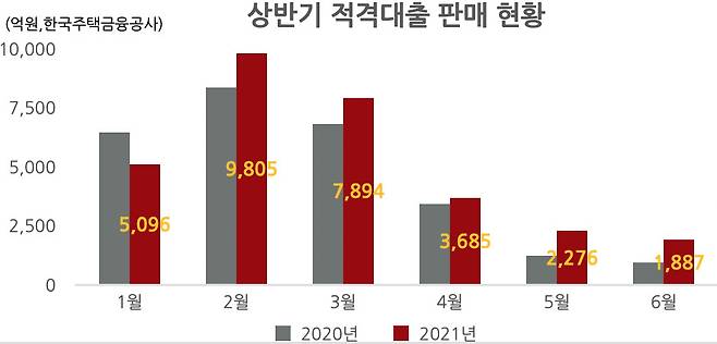 올해 주택금융공사(주금공)의 적격대출 총공급한도는 8조원이다. 상반기에 3조643억원이 나갔다. 3분기 기준 KB국민은행과 SC제일은행, NH농협은행은 일찌감치 분기 한도를 다 소진했고 우리은행도 분기를 다 채우기 전 한도가 바닥났다. 실행 규모 역시 전년 대비 커졌다. 상반기 적격대출 판매 현황을 보면 1월을 제외하고 판매가 전년 동기와 비교했을 때 모두 늘었다. 특히 5월과 6월은 전년에 비해 2배 가량 많이 판매됐다.