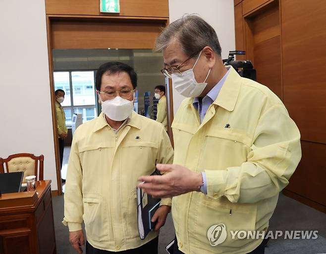 (서울=연합뉴스) 최재구 기자 = 유영민 대통령 비서실장과 서훈 국가안보실장이 28일 오전 청와대 여민관 영상회의실에서 열리는 국무회의에 참석하며 대화하고 있다. 2021.9.28