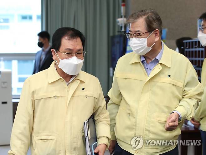 (서울=연합뉴스) 최재구 기자 = 유영민 대통령 비서실장과 서훈 국가안보실장이 28일 오전 청와대 여민관 영상회의실에서 열리는 국무회의에 참석하며 대화하고 있다. 2021.9.28