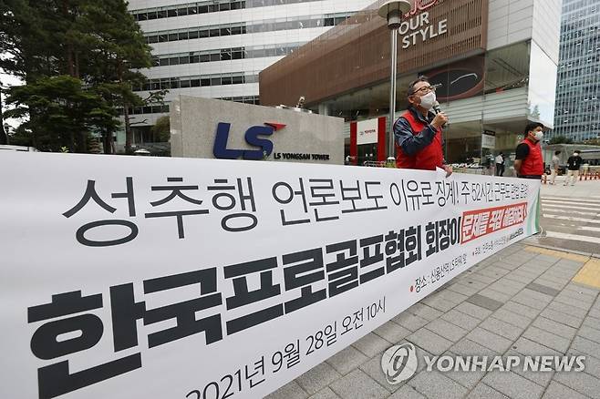(서울=연합뉴스) 임화영 기자 = 이선규 민주노총 서비스연맹 서비스일반노조 위원장이 28일 오전 서울 용산구 LS타워 앞에서 열린 기자회견에서 한국프로골프협회(KPGA) 회장에 직장 내 성추행, 주 52시간 제도 편법 운영 등 문제 해결을 촉구하며 KPGA노조의 무기한 철야 농성을 선포하고 있다. 2021.9.28