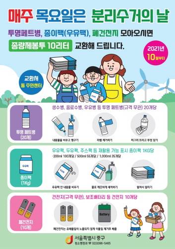 서울 중구, 투명페트병·종이팩·폐건전지 교환사업 추진
