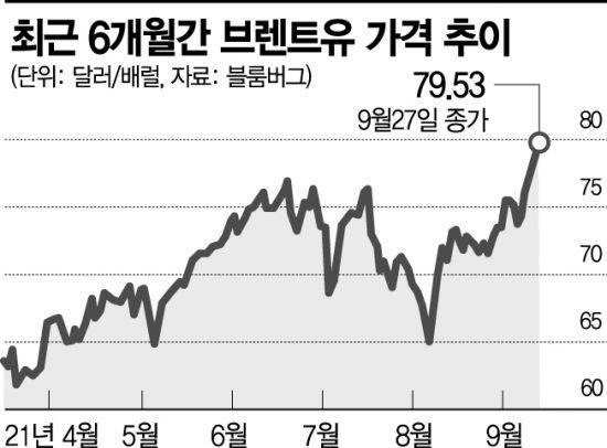 브렌트유는 이날 런던 국제선물거래소(ICE)에서 배럴당 79.53달러로 가격이 1.84% 올라 80달러에 육박했다. 2018년 10월 이후 최고치다. 블룸버그통신은 "심리적 저항선인 80달러를 넘어서지 못한 것은 일부 투기자들이 수익을 보고 있기 때문"이라면서 "수일 내로 80달러를 돌파할 것"이라고 내다봤다.