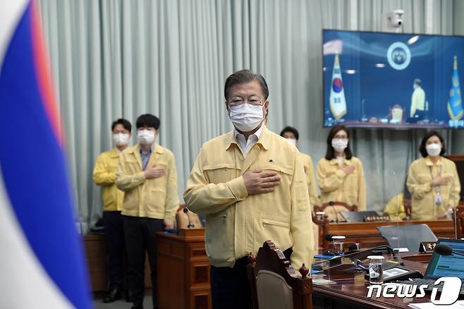 (서울=뉴스1) 이광호 기자 = 문재인 대통령이 28일 오전 청와대 여민관 영상회의실에서 열린 국무회의에 참석해 국기에 경례를 하고 있다.2021.9.28/뉴스1