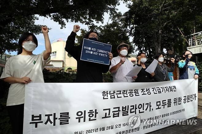 (서울=연합뉴스) 박동주 기자 = 28일 오전 서울 종로구 환경운동연합 마당에서 한남근린공원 조성 관련 기자회견이 열리고 있다. 2021.9.28