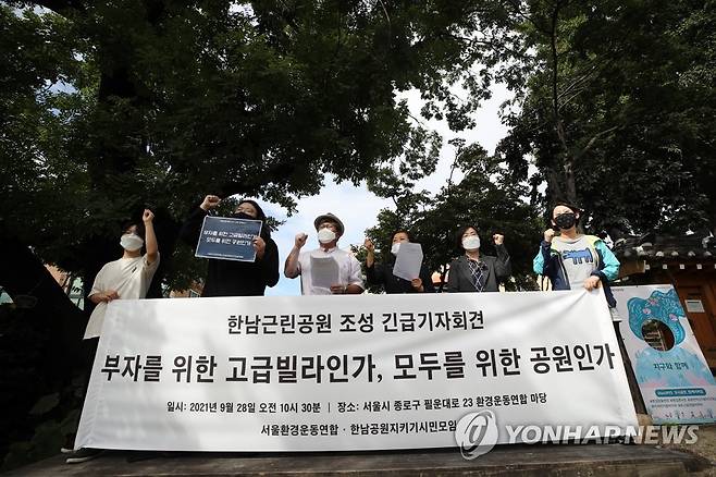 (서울=연합뉴스) 박동주 기자 = 28일 오전 서울 종로구 환경운동연합 마당에서 한남근린공원 조성 관련 기자회견이 열리고 있다. 2021.9.28