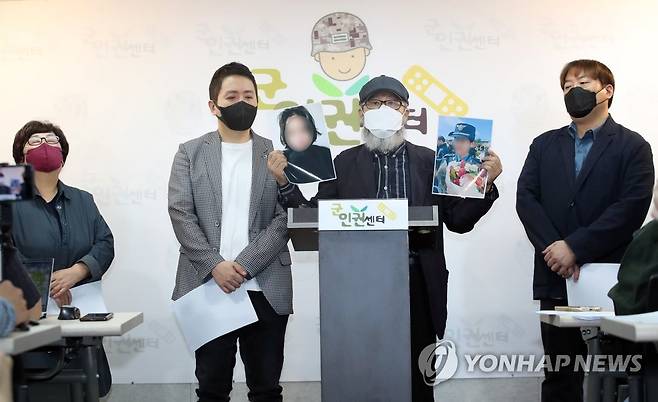 (서울=연합뉴스) 임헌정 기자 = 공군 성추행 피해자 고(故) 이 모 중사 부친이 28일 서울 마포구 군인권센터에서 열린 공군 성추행 피해자 사망사건 수사결과 비판 기자회견에서 딸의 사진을 들고 군의 수사를 비판하고 있다. 2021.9.28