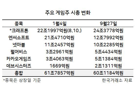 주요 게임주 시총은 연초와 비슷한 수준