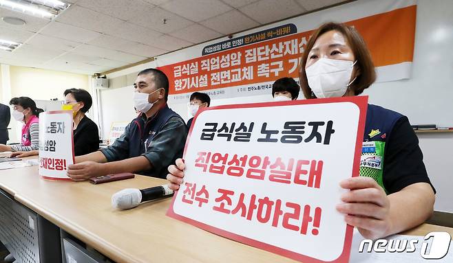 (서울=뉴스1) 조태형 기자 = 28일 오전 서울 중구 민주노총에서 급식실 직업성암 집단산재신청 및 환기시설 전면교체 촉구 기자회견 참가자들이 발언을 이어가고 있다. 2021.9.28/뉴스1