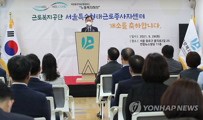 (서울=연합뉴스) 강민지 기자 = 28일 오전 서울 종로구 연합뉴스빌딩에서 근로복지공단 서울특수형태근로종사자 센터 개소식이 열리고 있다. 2021.9.28