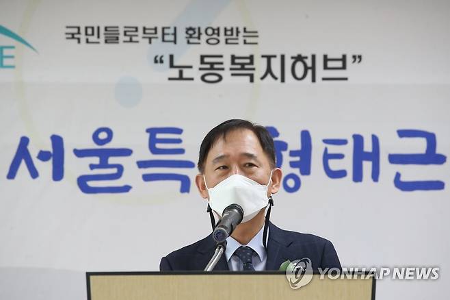 (서울=연합뉴스) 강민지 기자 = 28일 오전 서울 종로구 연합뉴스빌딩에서 열린 근로복지공단 서울특수형태근로종사자 센터 개소식에서 박화진 고용노동부 차관이 인사말을 하고 있다. 2021.9.28