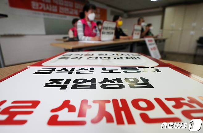 (서울=뉴스1) 조태형 기자 = 28일 오전 서울 중구 민주노총에서 급식실 직업성암 집단산재신청 및 환기시설 전면교체 촉구 기자회견 참가자들이 발언을 이어가고 있다. 2021.9.28/뉴스1