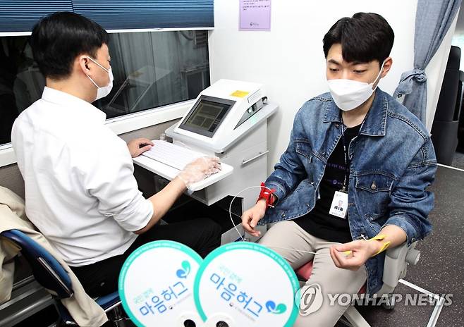 (서울=연합뉴스) 28일 국립정신건강센터 국가트라우마사업부와 동작구보건소 주관으로 선별진료소 코로나19 대응인력 심리지원을 위한 찾아가는 마음안심버스가 서울 동작구 보건소로 이동, 대응인력 및 직원들을 대상으로 정신건강 평가·스트레스측정·전문가 심리상담을 하고 있다. 2021.9.28