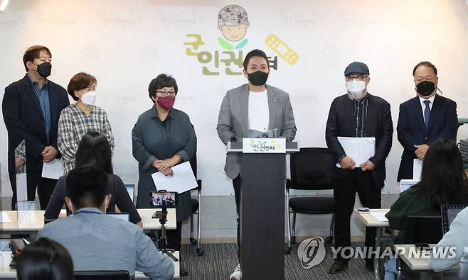 (서울=연합뉴스) 임헌정 기자 = 28일 서울 마포구 군인권센터에서 열린 공군 성추행 피해자 사망사건 수사결과 비판 기자회견에서 임태훈 군인권센터 소장이 발언하고 있다. 2021.9.28