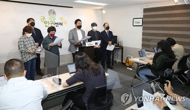 (서울=연합뉴스) 임헌정 기자 = 28일 서울 마포구 군인권센터에서 열린 공군 성추행 피해자 사망사건 수사결과 비판 기자회견에서 임태훈 군인권센터 소장이 발언하고 있다. 2021.9.28