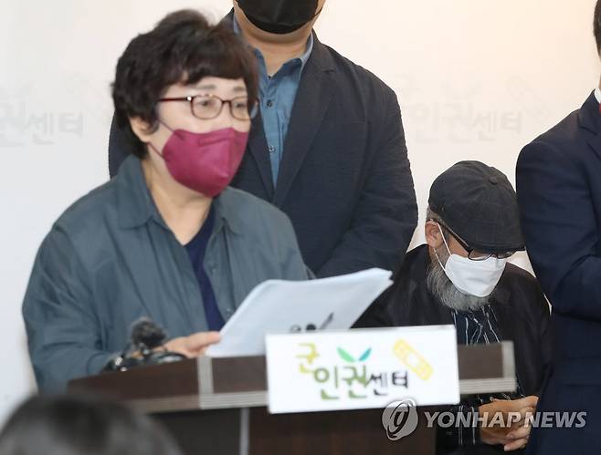 (서울=연합뉴스) 임헌정 기자 = 28일 서울 마포구 군인권센터에서 열린 공군 성추행 피해자 사망사건 수사결과 비판 기자회견에서 선임병들의 구타 등으로 지난 2014년 숨진 고(故) 윤 일병의 어머니가 발언하고 있다. 오른쪽은 공군 성추행 피해자 고 이 중사의 아버지. 2021.9.28