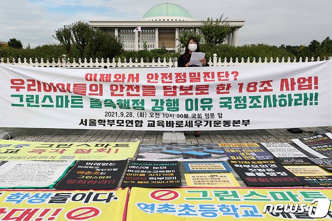 서울 대곡초, 역촌초, 대방초 등 그린스마트 미래학교 대상으로 선정 된 학교 학부모들은 이날 교육바로세우기운동본부·서울학부모연합과 함께 기자회견을 열고 "교육부는 그린스마트 미래학교로 이름만 바꾼 학교공간혁신사업에 대한 문제부터 투명하게 밝히고 혈세 18조 5천억원이 낭비되기 전에 당장 사업을 중단하라"면서 사업중단과 국회에 국정조사를 촉구했다. 2021.9.28/뉴스1