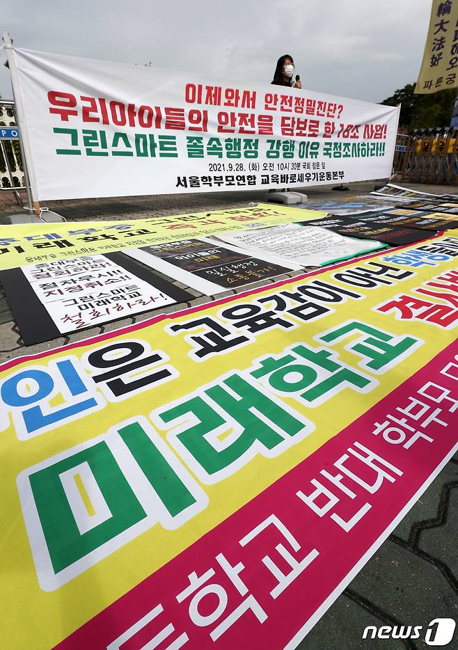 서울 대곡초, 역촌초, 대방초 등 그린스마트 미래학교 대상으로 선정 된 학교 학부모들은 이날 교육바로세우기운동본부·서울학부모연합과 함께 기자회견을 열고 "교육부는 그린스마트 미래학교로 이름만 바꾼 학교공간혁신사업에 대한 문제부터 투명하게 밝히고 혈세 18조 5천억원이 낭비되기 전에 당장 사업을 중단하라"면서 사업중단과 국회에 국정조사를 촉구했다. 2021.9.28/뉴스1
