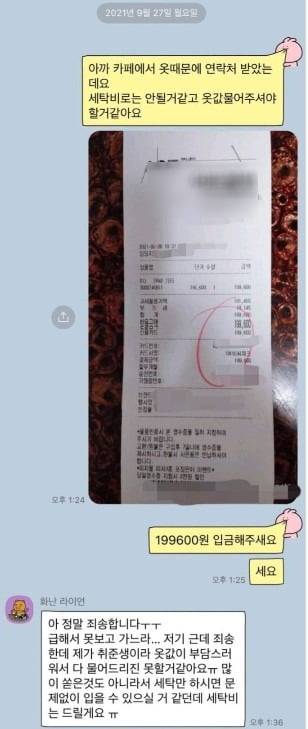 A 씨가 구매한 영수증을 문자메시지로 보내며 옷값을 달라고 요청하자 B 씨는 "저도 취준생이라 옷값을 드리긴 부담스럽다. 커피를 많이 쏟은 것도 아닌데 세탁만 하시면 입을 수 있는 것 아니냐"고 답했다.