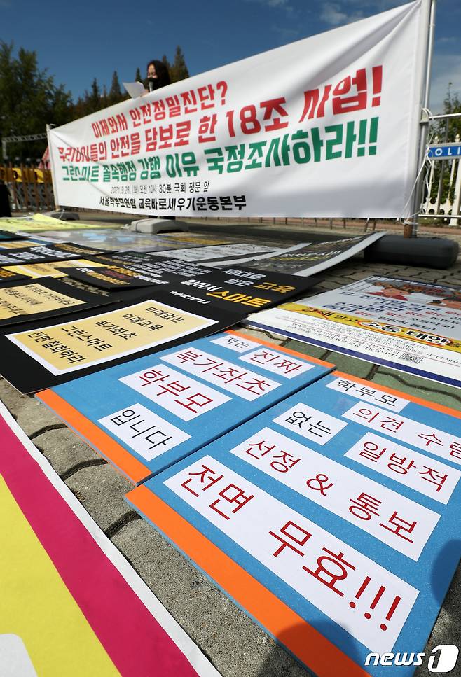 서울 대곡초, 역촌초, 대방초 등 그린스마트 미래학교 대상으로 선정 된 학교 학부모들은 이날 교육바로세우기운동본부·서울학부모연합과 함께 기자회견을 열고 "교육부는 그린스마트 미래학교로 이름만 바꾼 학교공간혁신사업에 대한 문제부터 투명하게 밝히고 혈세 18조 5천억원이 낭비되기 전에 당장 사업을 중단하라"면서 사업중단과 국회에 국정조사를 촉구했다. 2021.9.28/뉴스1