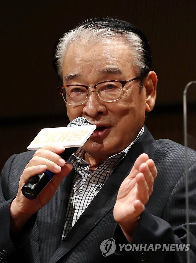 (서울=연합뉴스) 이재희 기자 = 배우 이순재가 28일 오전 서울 서초구 예술의전당 인춘아트홀에서 열린 '연극 리어왕' 기자간담회에서 인사말을 하고 있다. 2021.9.28