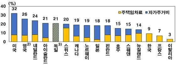 | 주요국의 소비자물가 내 주거비 비중 1) 2020년 OECD 가중치 기준(스위스, 스웨덴, 호주는 각국 통계청 기준), 2) CPIH 기준(CPI 기준 주거비(주택임차료) 비중은 9.4%), 3) 주택임차료에 자가주거비를 포함하여 발표. 자료:각국 통계청, OECD |