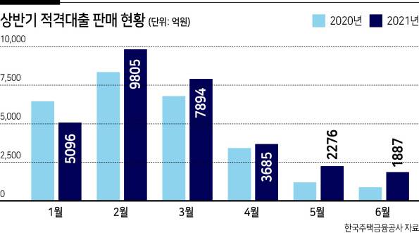 올해 주택금융공사(주금공)의 적격대출 총공급한도는 8조원이다. 상반기에 3조643억원이 나갔다. 3분기 기준 KB국민은행과 SC제일은행, NH농협은행은 일찌감치 분기 한도를 다 소진했고 우리은행도 분기를 다 채우기 전 한도가 바닥났다. 실행 규모 역시 전년 대비 커졌다. 상반기 적격대출 판매 현황을 보면 1월을 제외하고 판매가 전년 동기와 비교했을 때 모두 늘었다. 특히 5월과 6월은 전년에 비해 2배 가량 많이 판매됐다.